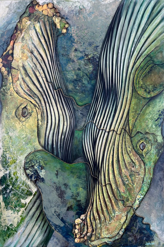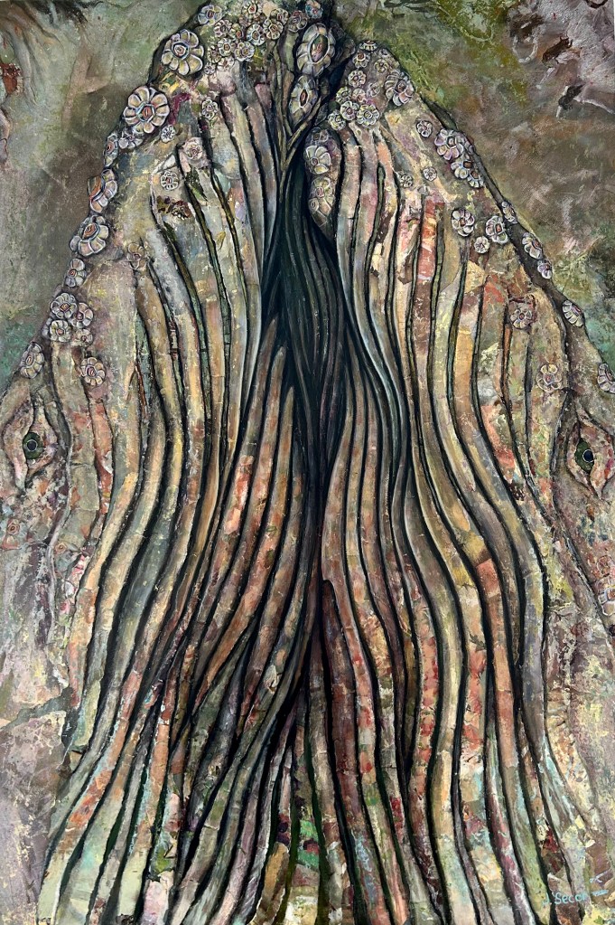 Prehistoric art is distant yet familiar, representing the wild, the past, and the present – stripping away all that is unnecessary to remind us the meaning of being human within the realm of nature. Cultures emerge, are destroyed, and then replaced by new ones. We as a species are straying further from our roots, and I fear that our primitive beginnings will be forgotten. This inspires me to focus on Mother Earth and represent her through my mixed media and collage process.